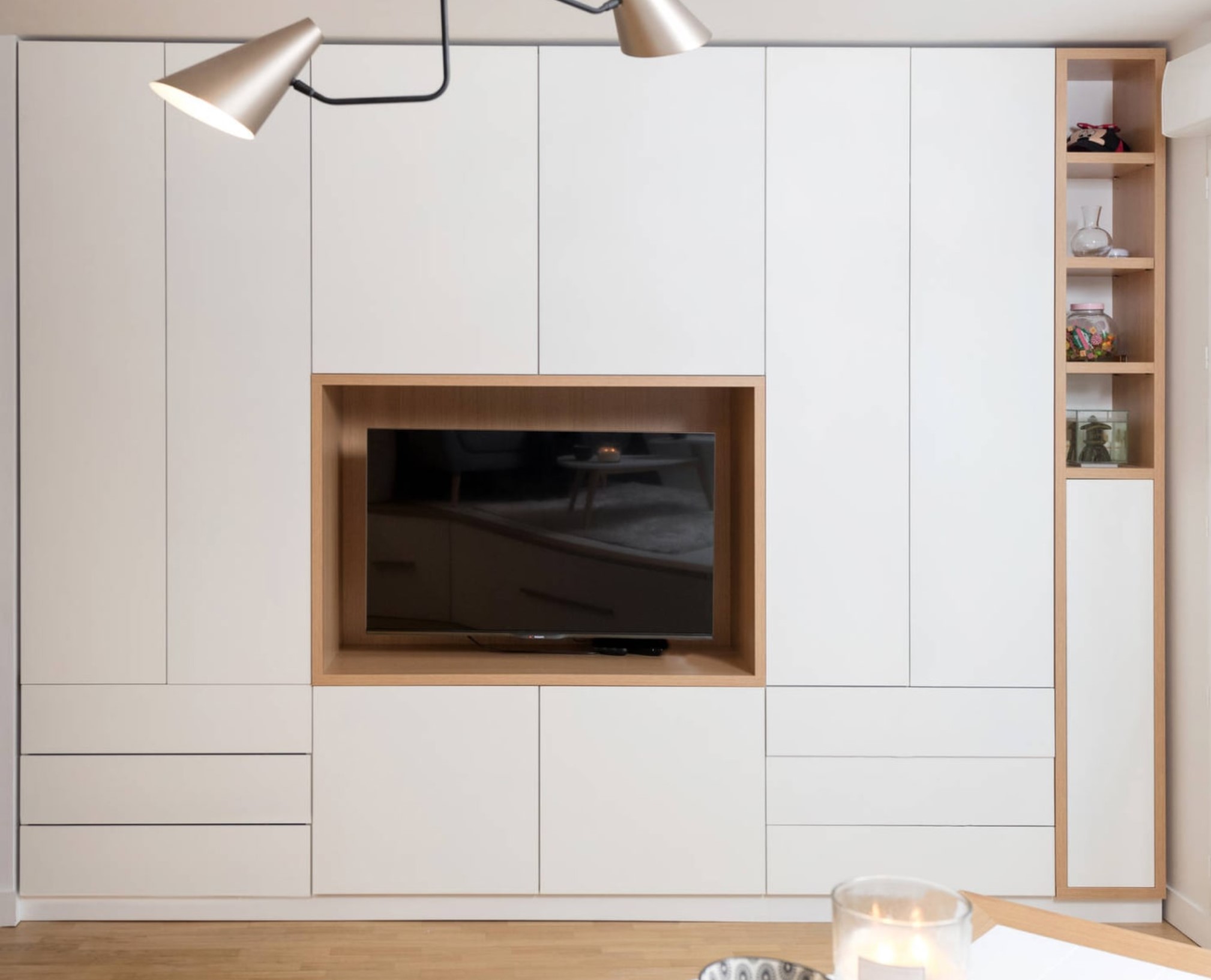 Diseñamos armarios y muebles de salón a medida teniendo en cuenta televisión, cables, almacenaje y proporciones del espacio.